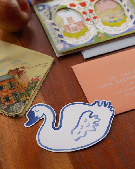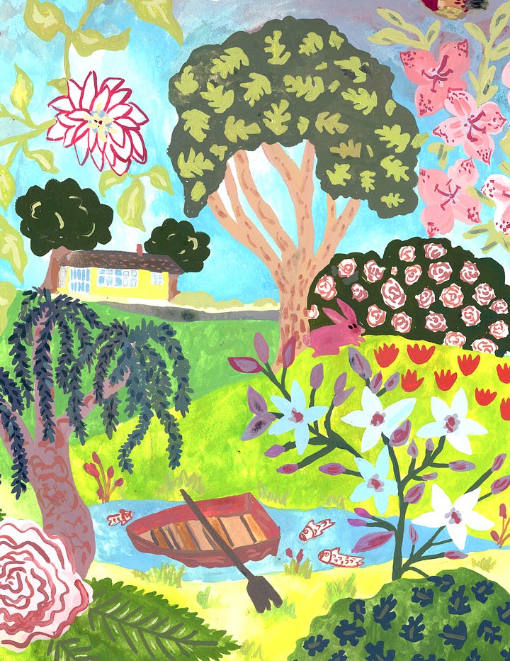 The envelope liner, painted with gouache, included a scene with the yellow cabin, flora + fauna, ducks, fish, and a rabbit (a nod to my brother-in-law’s Taiwanese heritage)