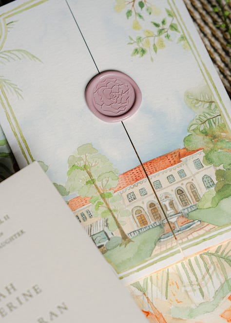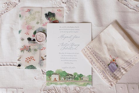 I realized an important thing about myself: I enjoy painting the pretty elements. I don’t enjoy figuring out how to get the invitations printed. I also prefer to work on weddings where I know the bride; and if I don’t know the bride, I’d like for someone to just tell me what paint pretty things to paint and then they handle the rest. Cue my paper angel: Schuyler from Polk Paper. Schuyler runs a luxury paper studio and was an absolute TREAT to work with for each of my family weddings. She gave me the freedom to paint the illustrations to suit each sister, and she handled all the paper/letterpress/graphic design goodness needed for each project. She’s so passionate and excellent in her work and I highly recommend her. So, as we delve into the following invitation suites, keep in mind that she’s the playmaker behind making my illustrations shine on paper.