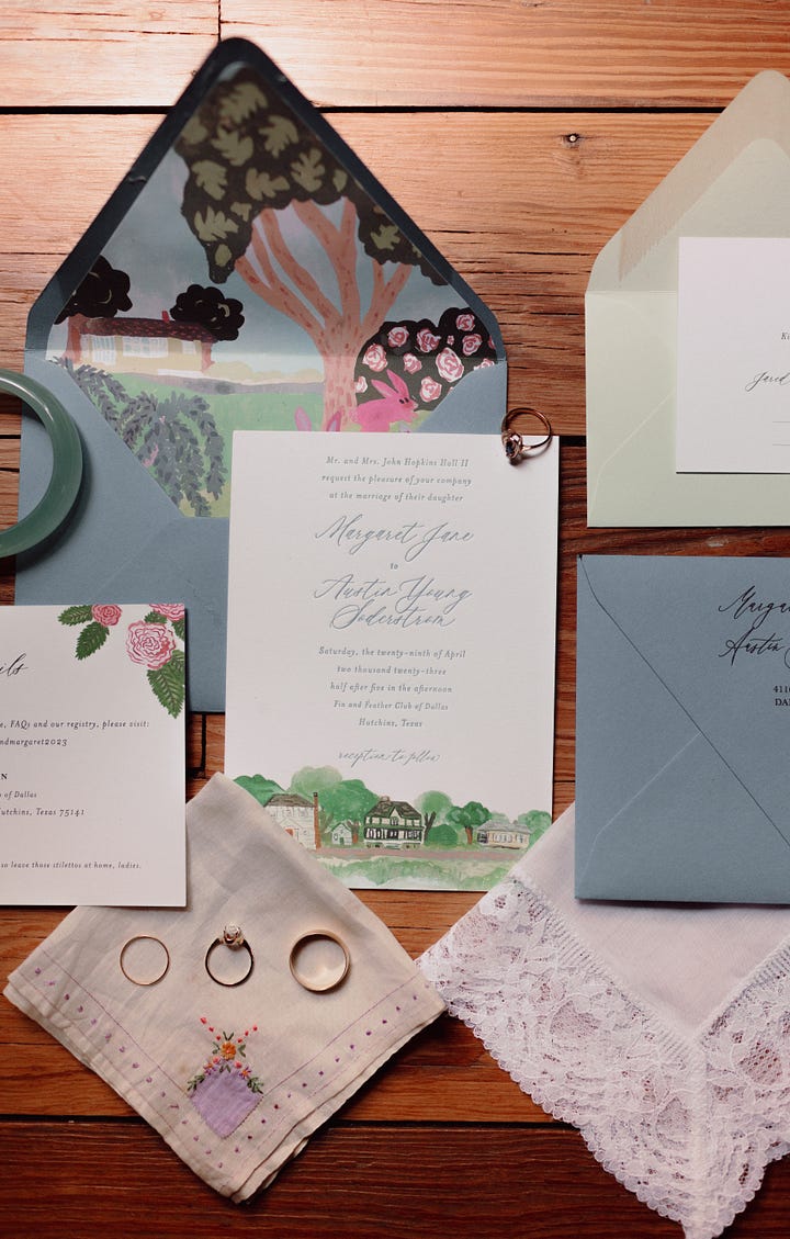 Margaret, the middle, always dreamt of getting married at Fin and Feather Club of Dallas, twenty miles from the city. Three generations of our family had been members at this small hunting and fishing club, and we grew up spending holidays and Saturdays fishing in the minnow pond and playing card games in our little yellow cabin. In the artwork for her invitations, I made sure to include the historic “Women’s Clubhouse”, “Men’s Clubhouse”, and our yellow cabin, all facing the pond (shown above).