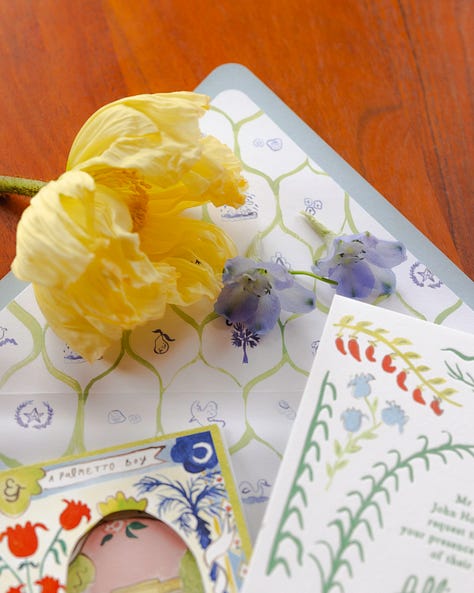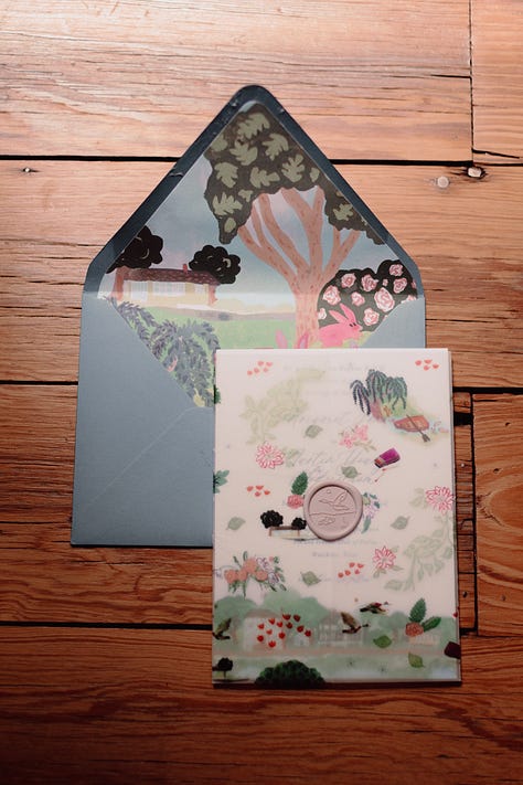 The vellum jacket that held the suite together included a repeat pattern of florals and illustrative elements pulled from the envelope liner artwork