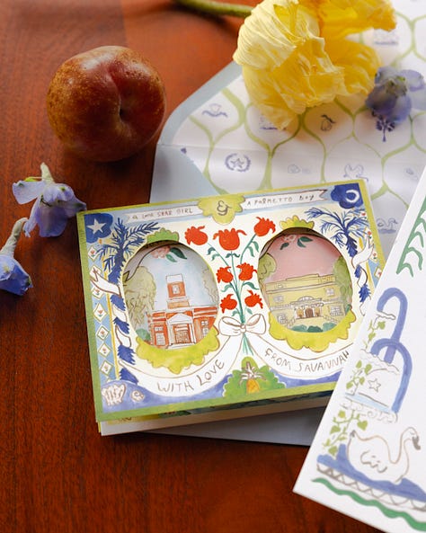 This card was placed inside a notecard with vignette holes on the front to showcase the buildings. The term “a Lone Star Girl and a Palmetto Boy” floats above the vignettes- a playful slogan to nod to our Texas and South Carolina upbringings.