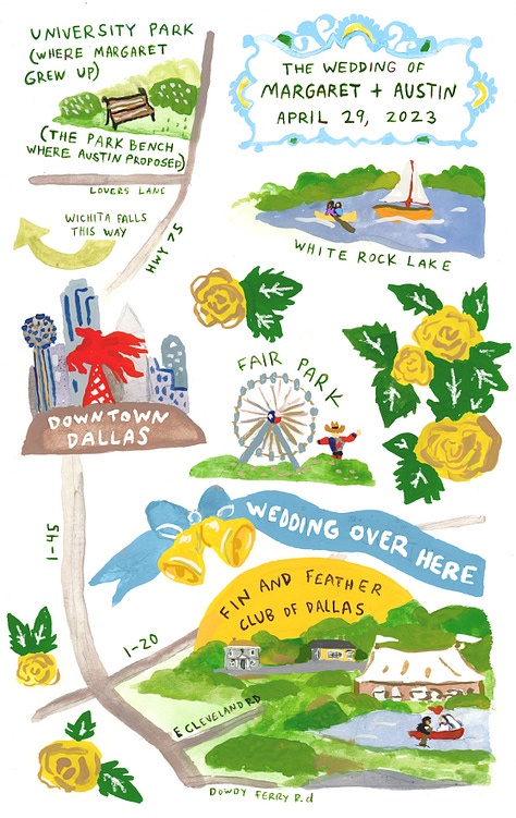 Below you can see the illustrated map I made to go on the back of the details card, to playfully show folks where the wedding was in relation to Dallas